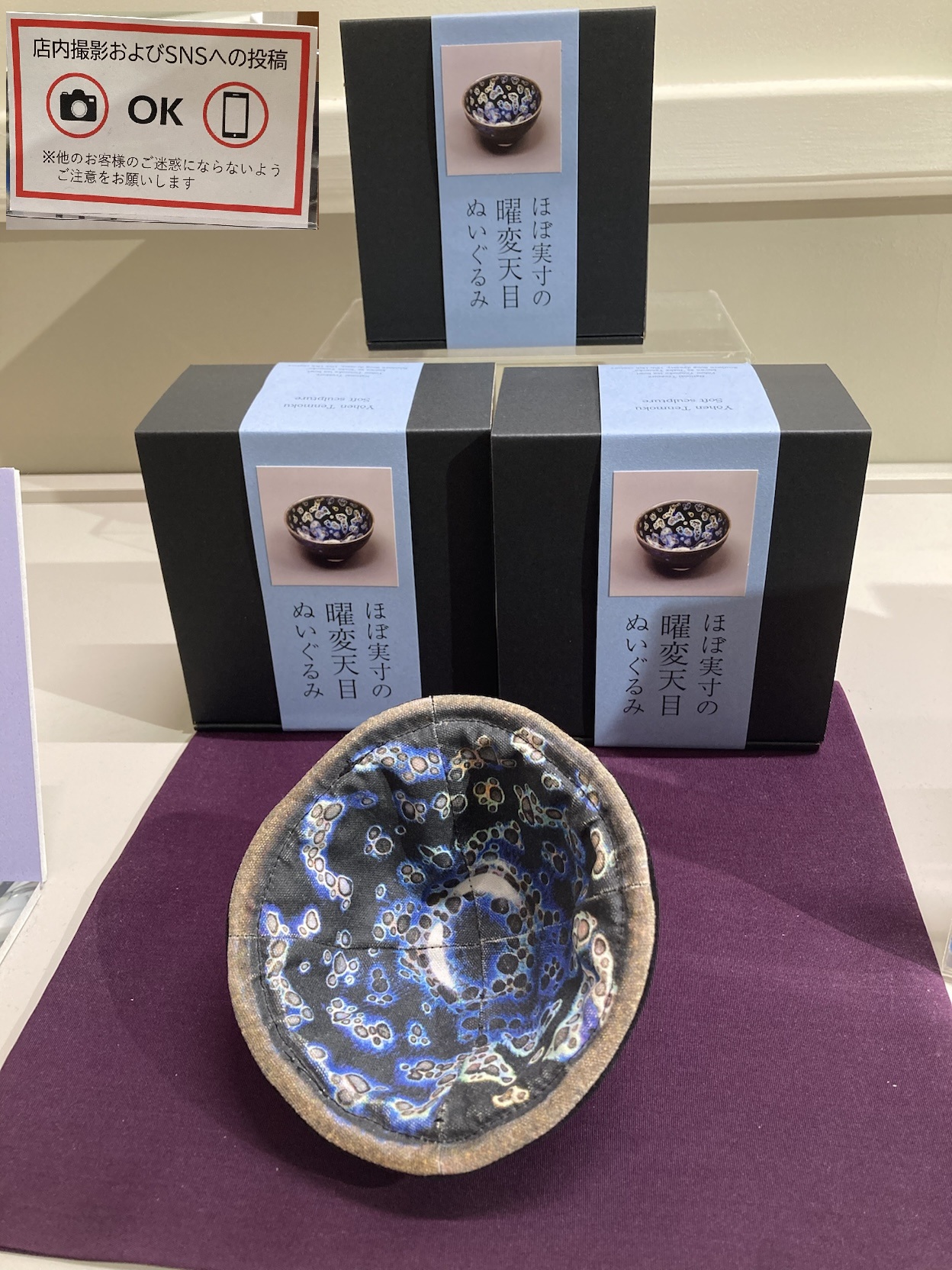 展示物は曜変天目以外撮影可能なのですが、ブログやSNSへの投稿はできないため、代わりにミュージアムショップで販売されていた『曜変天目ぬいぐるみ』(税込8,800円)の写真を載せます。
